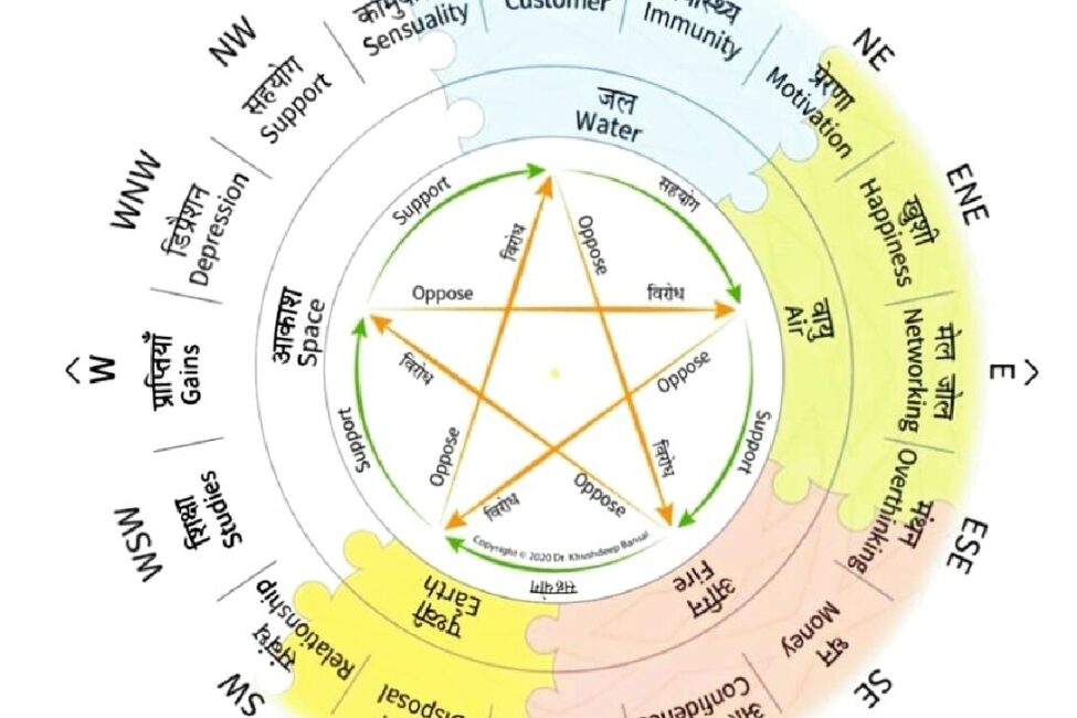 - पांच तत्व, उनके रंग, सहायक और विरोधी चक्र- पंच तत्वों के द्वारा इस समस्त सृष्टि का निर्माण हुआ है। मनुष्य का शरीर भी पाँच तत्वों से ही बना हुआ है।पंचतत्व को ब्रह्मांड में व्याप्त लौकिक एवं अलौकिक वस्तुओं का प्रत्यक्ष अथवा परोक्ष कारण और परिणति माना गया है। ब्रह्मांड में प्रकृति से उत्पन्न सभी वस्तुओं में पंचतत्व की अलग-अलग मात्रा मौजूद है। अपने उद्भव के बाद सभी वस्तुएँ नश्वरता को प्राप्त होकर इनमें ही विलीन हो जाती है।तुलसीदास जी ने रामचरितमानस के किष्किंधाकांड में लिखा है ”क्षिति जल पावक गगन समीरा। पंच रचित यह अधम सरीरा।”।यह पाँच तत्व है..क्रमश:, क्षिति यानी कि पृथ्वी, जल यानी कि पानी, पावक यानी कि आग, गगन यानी आकाश और समीर यानी कि हवा। वास्तु शास्त्र
